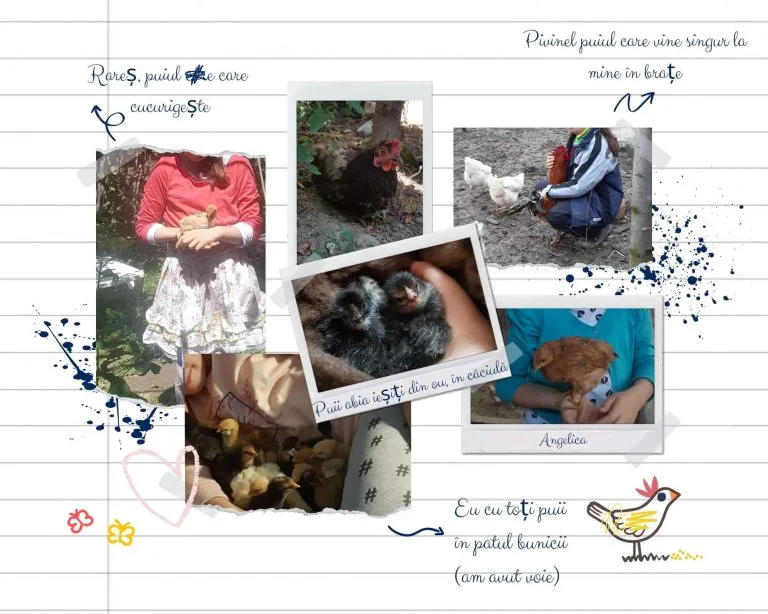 Acum că o știți pe Ioana, să vă spun ce mi-a povestit despre găinușele ei. Toate au câte un nume, o zi de naștere și o personalitate distinctă. Ce m-a fascinat cel mai tare au fost aventurile prin care acestea au trecut și cât de diferite sunt între ele. Unele găini sunt foarte mâncăcioase, altele din cale afară de grațioase, câteva mai sensibile de fel, altele mai curajoase, unii pui iubesc îmbrățișările, alții sunt răutăcioși, alții plimbăreți și uneori se întâmplă să devină chiar eroii ogrăzii.