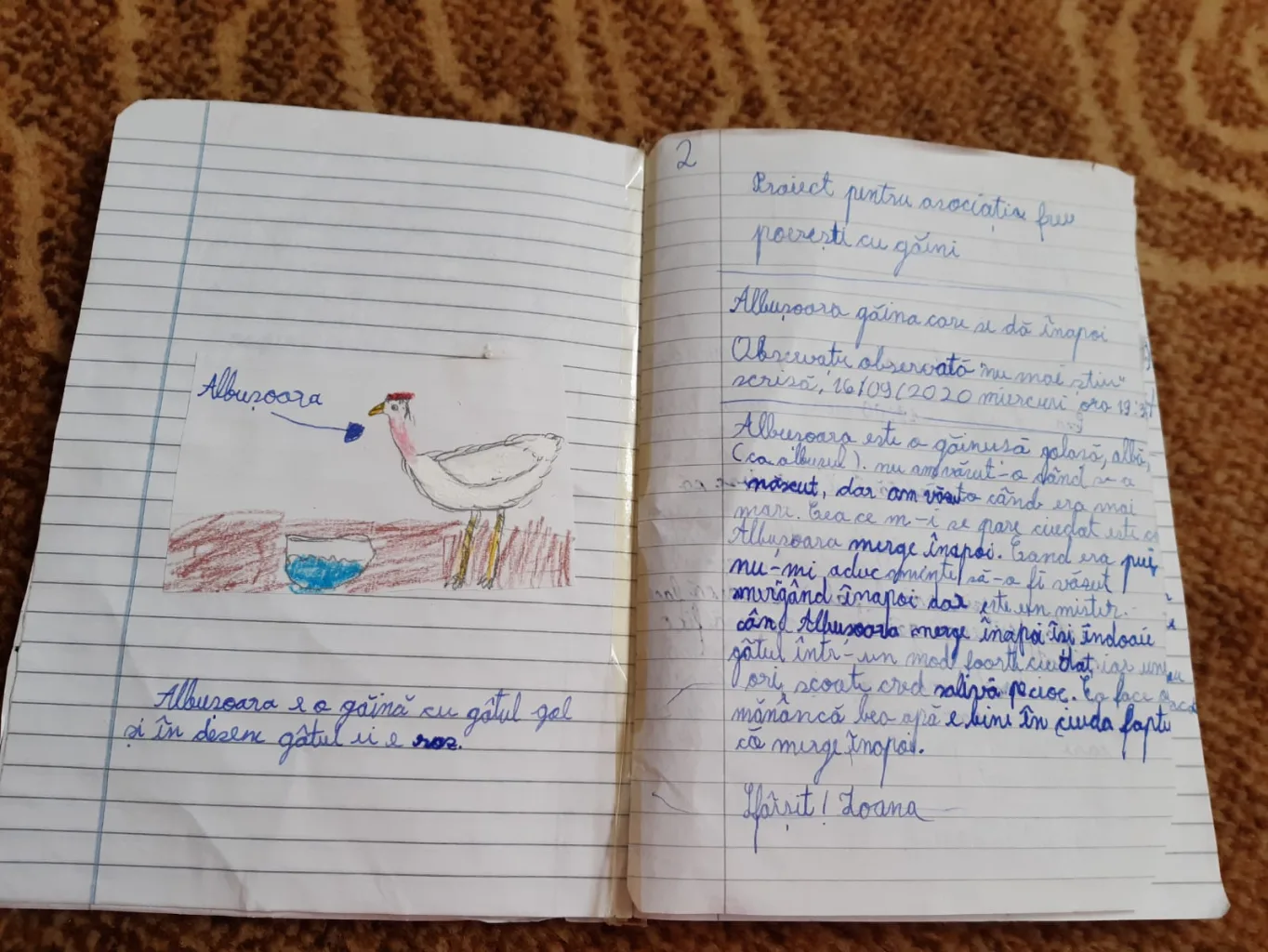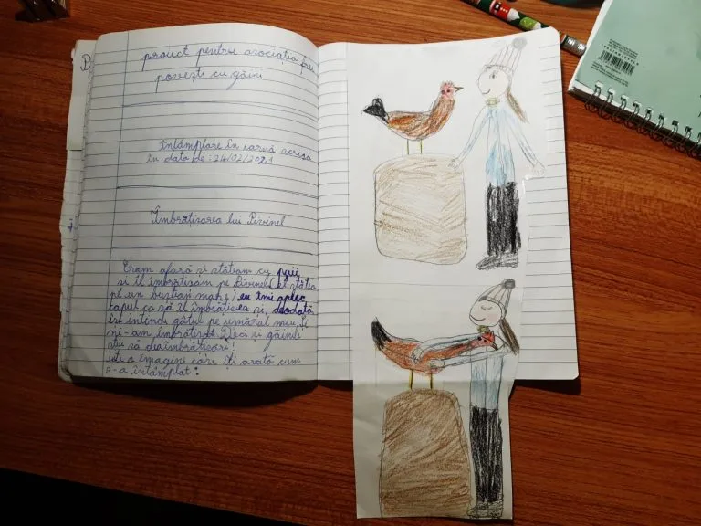 Din vorbă-n vorbă, am ajuns să aflu de la Ioana despre un cocoș care a început să cânte cât putea de tare pentru a-și preveni stăpânii că în țarcul găinilor intraseră câinii, despre un puișor care începea să puie neliniștit imediat cum se depărta de casă, și despre mulți alți pui, găini și cocoși. Peripețiile lor au fost scrise cu grijă de Ioana într-un caiet, alături de ilustrații și observații diverse, așa că vă invit și pe voi să vă bucurați acum de câteva dintre acestea.