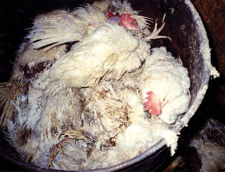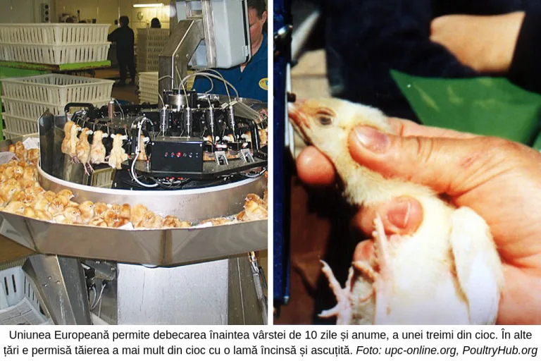 Apoi, femelele rămase, una câte una, sunt luate pe sus de o mână și împinse spre lama ascuțită a mașinii de tăiat ciocul. Acum este rândul Henei și, în timp ce fața ei este împinsă spre lamă, o durere agonizantă îi trece prin cioc și prin corp, făcând-o să bată din aripi, să țipe și să se scape pe ea. Puicuțele traumatizate, fiecare cu o gaură roșie în față, sunt stropite cu ceva chimic și încep una cate una să adoarmă.