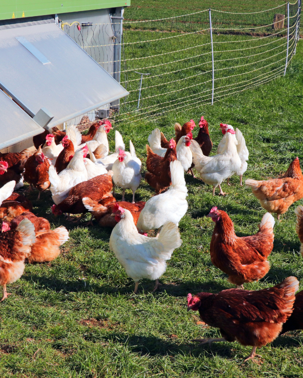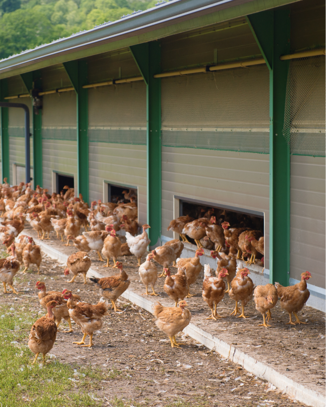 Cel mai prietenos pentru găini. Fără cuști, cu lumină, odihnă și acces la aer liber acoperit de vegetație. O viață cât mai aproape de natural.