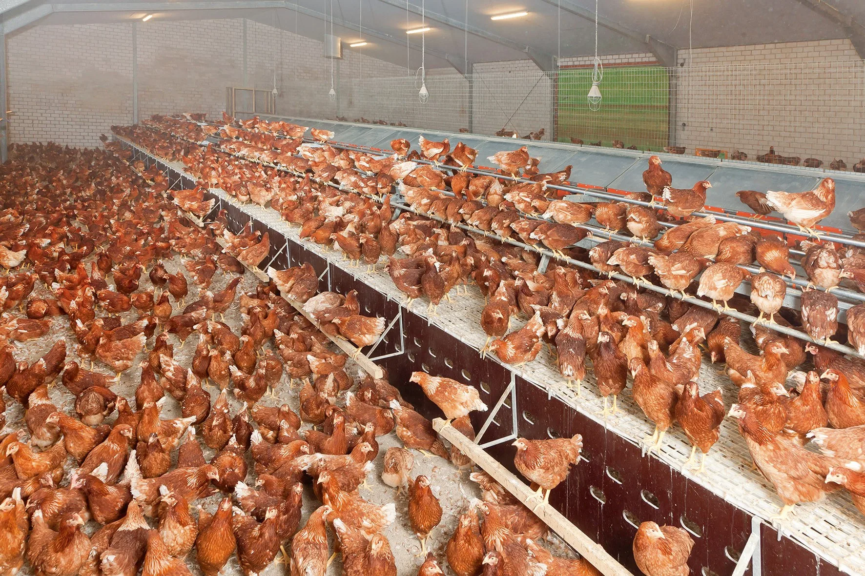 Fără cuști, dar găinile trăiesc înghesuite în hale mari, fără acces afară. Mai mult loc de mișcare, dar departe de o viață naturală.